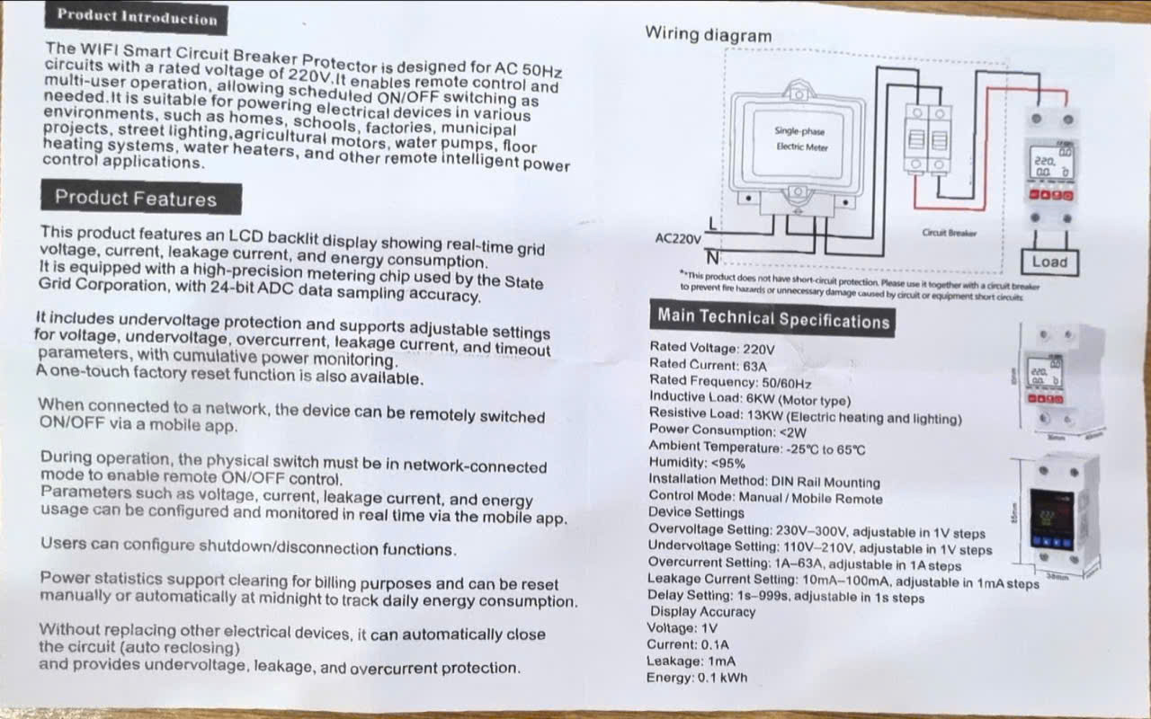 Bộ ngắt mạch bảo vệ Wiffi được thiết kế cho mạch điện xoay chiều 50HZ với điện áp định mức 220V. Nó cho phép điều khiển từ xa và vận hành đa người dung, cho phép bật tắt theo lịch trình khi cần thiết. Sản phẩm phù hợp để cấp điện cho các thiết bị điện trong nhiều môi trường khác nhau, chẳng hạn như nhà ở, trường học, nhà máy các dự án đô thị, chiếu sáng đường phố, động cơ nông nghiệp, máy bơm nước, hệ thống sưởi sàn, bình nước nóng và các ứng dụng điều khiển điện thông minh từ xa khác