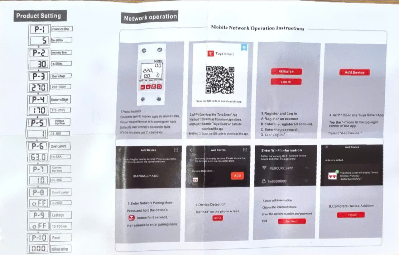 Thiết bị này bao gồm chức năng bảo vệ quá áp và hỗ trợ cài đặt có thể điều chỉnh cho các thông số điện áp, quá thấp, quá dòng, dòng rò và thời gian chờ, có khả năng khôi phục cài đặt gốc.